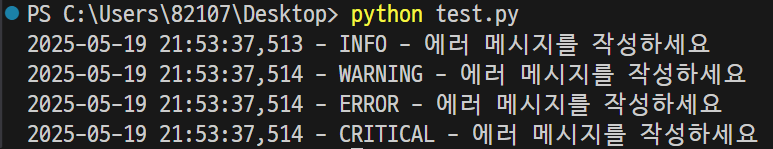 위에서 basicConfig와 StreamHandler로 설정한 로그를 기록하는 방법은 다음과 같습니다. logging과 기록하려는 로그의 레벨을 함께 작성합니다. 즉, logging 뒤에 원하는 로그 레벨 이름을 붙이고 괄호 안에 메시지를 전달하면 됩니다.