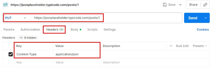 PUT 요청으로 게시물을 수정하는 API를 테스트하겠습니다. Method를 PUT으로 변경하고 URL을 다음과 같이 작성합니다. 그리고 Headers 탭을 클릭 후, Key와 Value를 다음과 같이 입력합니다.