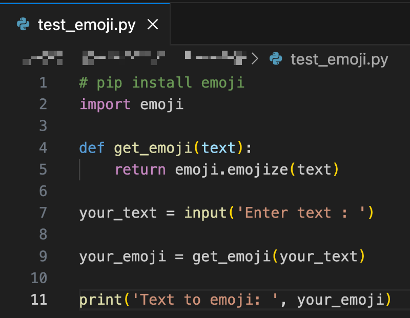 텍스트를 입력받아 이모지 변환 함수를 실행하는 방법은 다음과 같이 input을 추가합니다. 위에서 생성한 get_emoji 함수를 test_emoji.py 파일로 저장하여 텍스트를 input으로 입력받으면 이모지로 변환 후 출력하는 방식입니다.